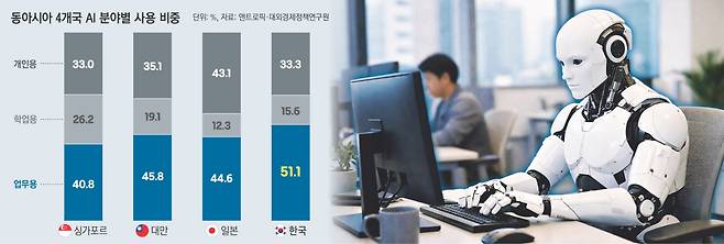 분석 결과, 한국의 AI 업무용 사용 비율은 51.1%로 4개국 중 가장 높았다. 대만은 45.8%, 일본은 44.6%, 싱가포르는 40.8%로 모두 40%대에 머물렀다.