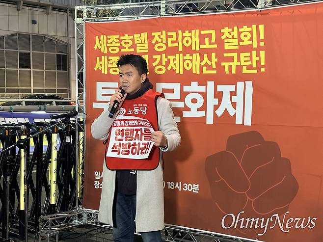 | ▲ 고진수 세종호텔지부장 등 시민 12명을 업무방해 등의 혐의로 강제로 연행한 경찰에 항의하는 투쟁 문화제가 2일 오후 6시 30분부터 서울 중구 세종호텔 정문 앞에서 열렸다. 이백윤 노동당 대표가 발언하고 있다. 세종호텔 해고노동자들과 세종호텔 정리해고 철회를 위한 공동대책위원회, 연대 시민들은 지난 1월 14일부터 세종호텔 로비에서 정리해고 철회를 위한 농성을 이어가다 2일 오전 10시경 경찰에 연행됐다. |