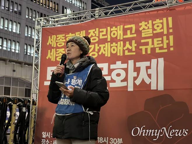 | ▲ 고진수 세종호텔지부장 등 시민 12명을 업무방해 등의 혐의로 강제로 연행한 경찰에 항의하는 투쟁 문화제가 2일 오후 6시 30분부터 서울 중구 세종호텔 정문 앞에서 열렸다. 세종호텔 해고노동자인 김란희씨가 발언하고 있다. 세종호텔 해고노동자들과 세종호텔 정리해고 철회를 위한 공동대책위원회, 연대 시민들은 지난 1월 14일부터 세종호텔 로비에서 정리해고 철회를 위한 농성을 이어가다 2일 오전 10시경 경찰에 연행됐다. |