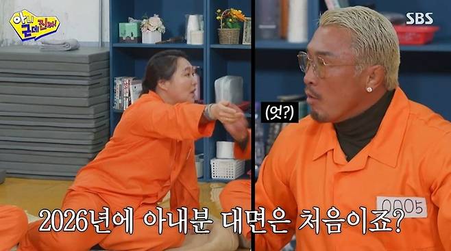 이수지가 "2026년에 얼굴 처음 보죠"라고 묻자 추성훈은 생각하다가 "그러네?"라고 인정했다. 추성훈은 아내를 향해 한마디하란 말에 "작년엔 바쁘게 지냈지만, 올해도 바쁘게 지낼 거다"라고 선언해 모두를 당황케 했다. 추성훈은 "아내가 사랑이를 계속 보고 있어서 감사하다. 힘든 게 많을 텐데 열심히 해줘서 든든하다"라면서 "그래도 힘들 때 있으면 가끔씩 전화 줘"라며 타인에게 얘기하듯 전했다.