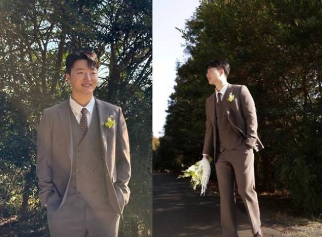 공개된 사진 속 그는 푸른 나무가 우거진 야외 공간에서 단정한 슈트 차림으로 포즈를 취하고 있다. 또 다른 사진에서는 한 손에 부케를 든 모습으로 시선을 끌었다.