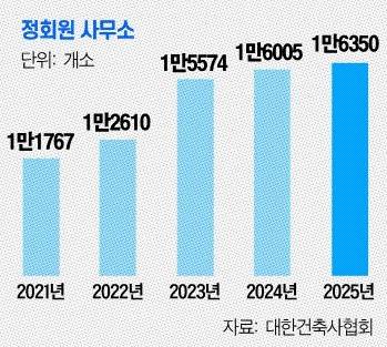 2일 대한건축사협회에 따르면 협회 정회원 수는 2021년 1만2462명에서 지난해 1만7472명으로 늘어 4년 새 약 40.2% 증가했다. 같은기간 건축사사무소 역시 4588곳 늘어 약 39% 확대됐다.