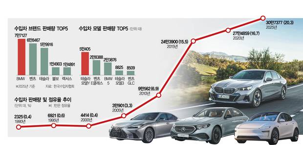 수입차 점유율은 2002년(1.4%) 처음 1%를 넘은 뒤 2012년(10.0%) 10년 만에 10% 선을 넘어섰다. 이후 꾸준히 성장해 코로나19 팬데믹 당시인 2022년 역대 최고인 19.7%를 찍었지만 20%의 벽을 넘지는 못했다. 수입차 판매량 또한 2015년부터 20만 대 범위를 오르내리다 지난해(30만 7377대)에야 30만 대 고지에 올라섰다.