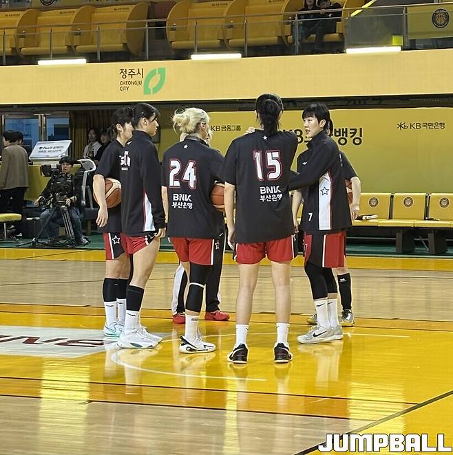 2일 BNK금융 2025~2026 여자프로농구 청주 KB스타즈와 부산 BNK 썸의 맞대결이 열린 청주 KB스타즈 챔피언스 파크. 경기 시작 1시간 반 전인 17시 30분 경, BNK는 선수단 전원이 박혜진의 주도 하에 한 데 모여 있었다.