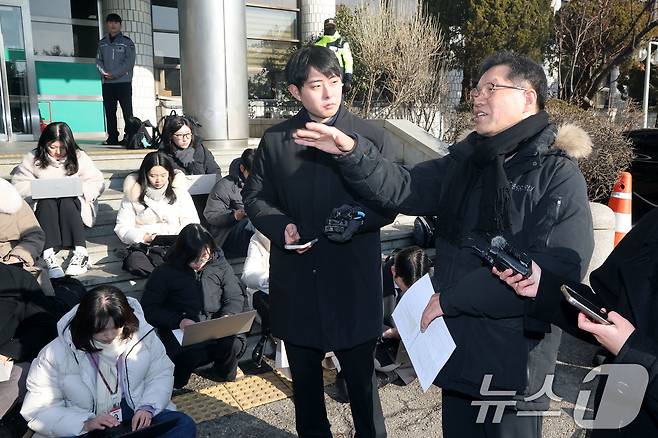 (서울=뉴스1) 이광호 기자 = 소녀상 철거를 요구하며 위안부 피해자들을 모욕한 혐의를 받는 위안부법폐지국민행동의 김병헌 대표가 3일 오전 경찰 조사를 받기 위해 서울 서초경찰서에 출석하며 취재진 질문에 답하고 있다. 2026.2.3/뉴스1