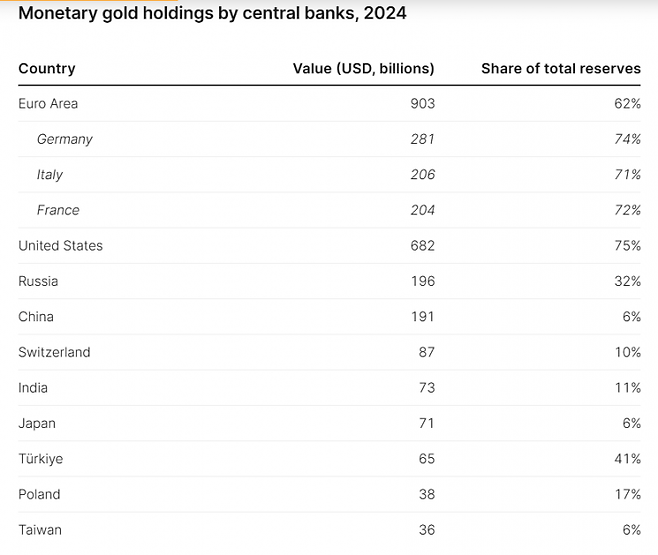 유로존 국가들과 미국의 중앙은행은 1970년 이후 금 순매도자였지만, 여전히 2024년말 기준 전 세계 금 보유의 약 57%를 차지하고 있다.