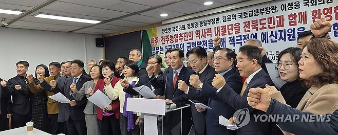 (전주=연합뉴스) 김동철 기자 = 완주전주통합추진연합회와 완주역사복원추진위원회 등 전주·완주 행정통합 찬성단체들이 3일 전주시청에서 기자회견을 열고 "안호영 의원의 전주·완주 통합에 대한 역사적 결단을 환영한다"고 밝히고 있다. 2026.2.3