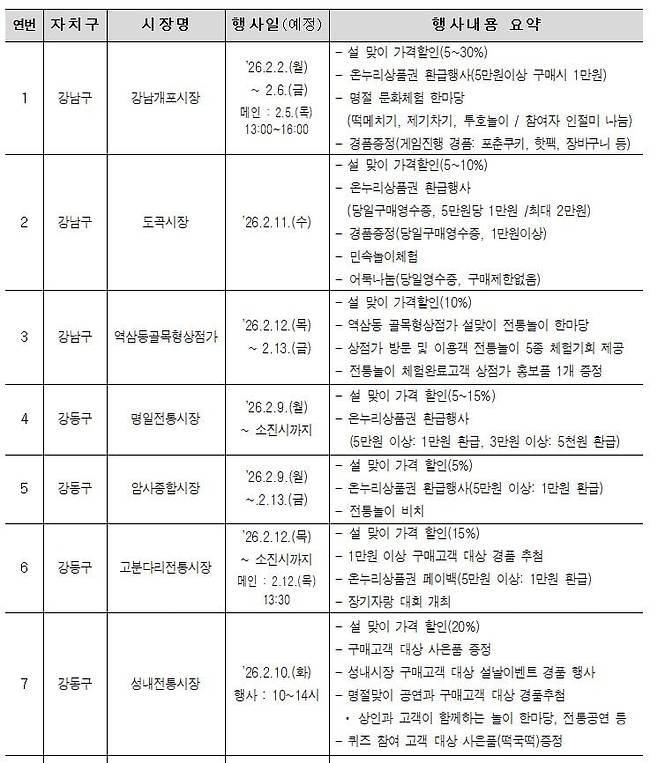 강남구 강남개포시장에서는 설을 앞두고 주요 품목을 5~30% 할인 판매한다. 5만원 이상 구매하면 온누리상품권 1만원을 돌려주는 환급 행사도 열린다. 떡메치기와 제기차기 같은 전통놀이 체험과 경품 행사도 함께 진행된다.
