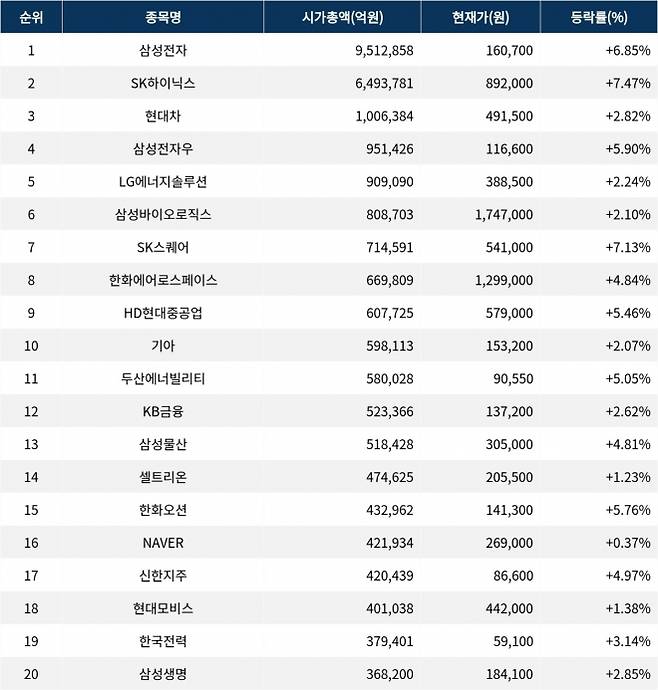 3일 오후 12시 20분 한국거래소에 따르면, 시가총액 1위 삼성전자(005930)는 현재가 16만 700원으로 전 거래일 대비 6.85% 상승하며 강세를 보이고 있다. 시가총액은 951조 2858억원이며, 외국인비율은 51.62%를 기록하고 있다. 반도체 대장주인 SK하이닉스(000660) 역시 89만 2000원으로 7.47% 상승하고 있으며, 거래량은 292만 7900주에 달한다.