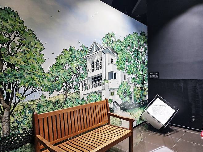 | ▲ 만화 <풀하우스> 속의 한 장면을 재현해 놓은 공간 이 벤치에 앉아 사진을 찍을 수 있게끔 포토존을 꾸려 놓았다. 풀하우스는 드라마로 제작되어 방영되기도 했다. (송혜교, 정지훈 출연) |