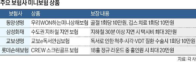보장 내용이 독특한 미니보험도 눈길을 끈다. 삼성화재는 수도권 지하철이 30분 이상 지연되면 택시·버스 등 대체 교통비를 월 1회 최대 3만원까지 보장하는 ‘수도권 지하철 지연 보험’을 판매 중이다. 지연된 지하철에서 내려 두 시간 내에 택시 등을 이용한 뒤 영수증을 앱에 올리면 보험금을 지급한다. 보험료 1400원으로 한번 가입하면 1년간 보장받을 수 있다.