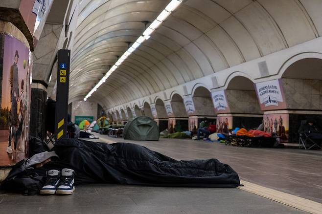 [키이우=AP/뉴시스] 3일(현지 시간) 우크라이나 키이우 시민들이 러시아의 미사일과 드론 공습을 피해 방공호로 사용되는 지하철역에 대피해 잠자고 있다. 2026.02.03.