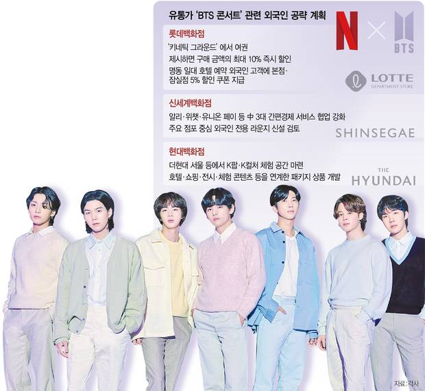 K팝 그룹 방탄소년단(BTS)의 콘서트 일정이 다가오면서 외국인 고객을 겨냥한 유통업계의 전략이 윤곽을 드러내고 있다. 약 3년 9개월 만에 컴백하는 BTS 공연을 직접 보기 위해 한국을 찾는 외국인 관광객 유입이 늘어날 것으로 예상되기 때문이다. 올해 내수 부진이 예상되는 가운데 유통업계가 외국인을 핵심 고객으로 설정하고 할인 프로모션과 이벤트를 확대하는 모습이다.