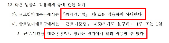 그런데 총 227쪽에 달하는 특별법 발의안에 마지막 장에 언급된 '글로벌미래특구'에서는 최저임금법 제6조를 적용하지 않고, 근로기준법 제50조에도 불구하고 1주 또는 1일의 근로시간을 대통령령으로 정하는 범위에서 달리 적용할 수 있다고 명시했다.