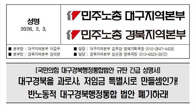 국민의힘이 대구광역시와 경상북도를 통합해 정부 직할 '대구경북특별시'를 설치하는 내용을 골자로 하는 특별법을 발의한 가운데, 지역 노동계가 강하게 반대하고 나섰다.