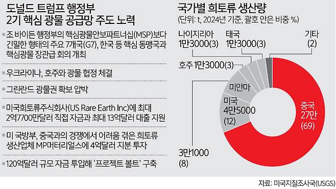 조 바이든 행정부도 핵심광물 공급망 다변화를 위한 노력을 기울였지만, 트럼프 행정부는 좀 더 직접적으로 동맹국들을 압박하고 자국 기업들을 지원해 왔다. 우크라이나, 호주와 자원 접근을 위한 협정을 체결했고, 그린란드에 대해서도 안보 문제뿐만 아니라 꾸준히 광물 개발권을 주장하고 있다. 지난주에는 미국희토류주식회사(US Rare Earth Inc)에 최대 2억7700만달러(약 4000억원)의 직접 자금과 최대 13억달러(약 1조8000억원)의 대출을 지원해 희토류 및 자석 공급망 구축을 지원하기로 했다.
