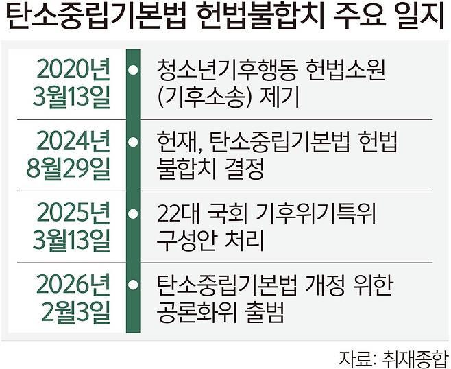 국회가 2024년 8월 헌법재판소로부터 헌법불합치 결정을 받은 '기후위기 대응을 위한 탄소중립·녹색성장 기본법'(탄소중립기본법)에 대한 개정 논의에 본격 착수했다.