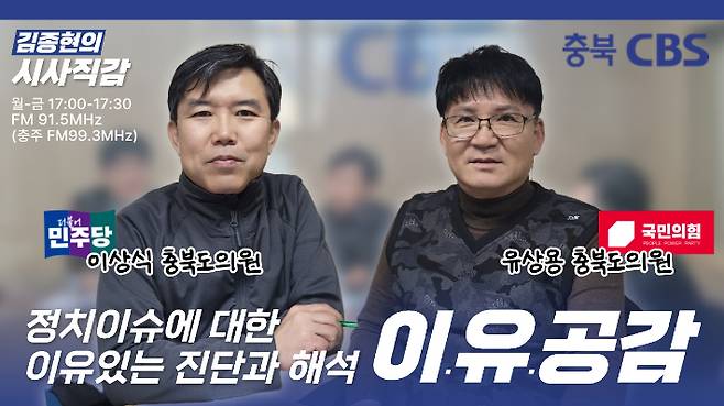 ◇ 김종현> <시사직감> 오늘은 <이유공감> 코너로 진행됩니다. 더불어민주당 이상식 충북도의원, 국민의힘 유상용 충북도의원, '이', '유' 두 정치인과 함께 이슈에 대한 이유 있는 진단과 해석으로 청취자들과 공감해 가는 토크 <이유공감> 시간입니다. 오늘도 최근 정치 이슈, 사회적 이슈, 지역 이슈까지 시간이 허락하는 한 두루 이야기 나눠보도록 하겠습니다. 오늘 프로그램은 유튜브 충북CBS를 통해서도 실시간 시청하실 수 있습니다. 이상식, 유상용 도의원 스튜디오에 나와 계십니다. 두 분 의원님, 안녕하십니까?