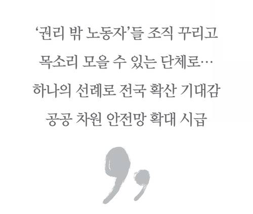 송 위원장은 경제적 지원의 의미를 넘어 불안정 노동자들을 묶어내는 시도가 됐으면 좋겠다고 했다. 그는 “헌법에는 노동자들이 노동조합을 할 수 있는 권리, 교섭할 수 있는 권리 등을 ‘노동기본권’으로 명시하고 있지만, 불안정 노동자들은 교섭을 누구와 해야 하는지조차 알기 어렵다”며 “이들이 모일 수 있는 조직을 꾸리고, 목소리를 모을 수 있는 단체가 됐으면 한다”고 말했다.