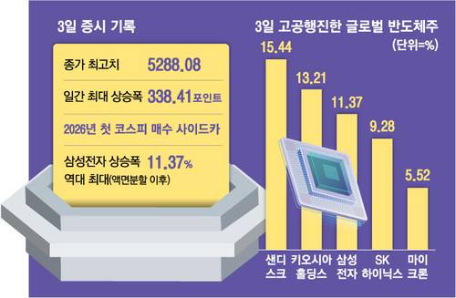 ![코스피가 3일 7% 가까이 급등해 종가 기준 사상 최고치를 경신한 3일 서울 하나은행 본점 딜링룸에서 딜러들이 업무를 보고 있다. 이날 코스피는 전장보다 338.41포인트(6.84%) 오른 5,288.08에 거래를 마감했다. 코스닥 지수는 전장보다 45.97포인트(4.19%) 오른 1,144.33에 장을 마쳤다. [연합뉴스]](https://img4.daumcdn.net/thumb/R658x0.q70/?fname=https://t1.daumcdn.net/news/202602/03/mk/20260203202403509anoi.jpg)