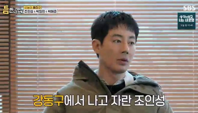이날 '틈만 나면' 촬영이 진행된 서울 강동구에서 학창시절을 보냈다는 그는 "초, 중, 고등학교를 다 다니고 2006년 '비열한 거리' 이후 송파구 방이동으로 이사를 갔다. 지금은 방이동의 독거노인"이라며 너스레를 떨었다. 이에 박정민이 "강동인들은 강동에 대한 자부심이 굉장하더라"고 하자 조인성은 "그렇다. 우리 강동구에 좋은 학교가 많다"고 뽐냈다.