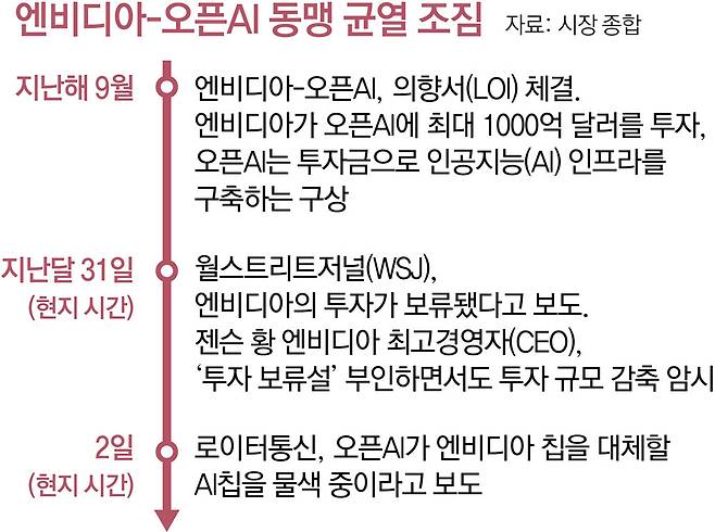 시장에서는 투자를 받고, 그 돈으로 다시 AI칩을 구매하기로 하며 AI 열풍을 주도해 온 두 강자의 균열이 불러올 영향에 긴장하고 있다. 자칫하면 AI 수요와 기업들의 가치가 과대평가되었다는 ‘AI 버블론’이 재부상할 수도 있다는 우려다.