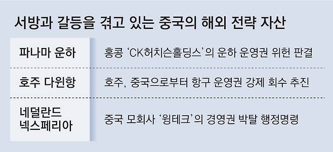 중국은 또 호주 북부의 다윈항 운영권, 네덜란드의 차랑용 반도체 기업 넥스페리아의 경영권 등을 놓고도 호주, 네덜란드 정부와 갈등을 빚고 있다. 호주, 네덜란드의 행보에도 미국의 입김이 미쳤다는 게 중국 측 주장이다. 덴마크령 그린란드에 대한 병합 시도 등 ‘미국 우선주의’로 일관하는 트럼프 대통령과 ‘일대일로(一帶一路)’ 사업을 통해 세계 곳곳의 인프라와 주요 전략 자산에 투자했던 중국의 충돌이 계속될 것이라는 관측이 나온다.