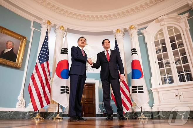 (AFP=뉴스1) 김명섭 기자 = 마코 루비오 미국 국무장관이 3일(현지시간) 워싱턴DC 국무부에서 조현 대한민국 외교부 장관과 악수하고 있다.