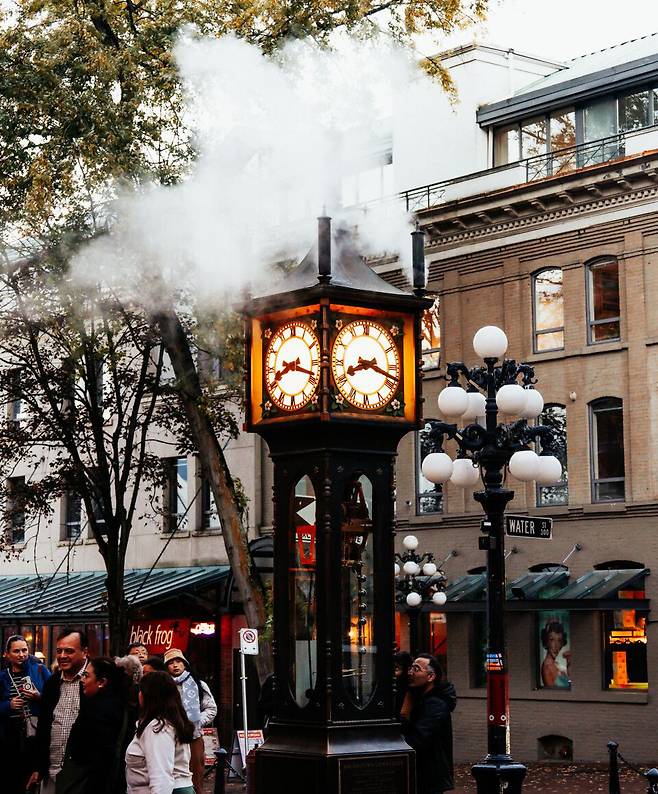 개스타운에서 제일 유명한 랜드마크는 개스타운 증기 시계. 1977년에 제작된 증기 시계로 증기를 일부 동력으로 활용하면서도 전기 모터를 함께 쓴다. 15분마다 증기를 내뿜으며 시간을 알리는데, 어딘가 목쉰 소리 같은 매가리 없는 멜로디가 의외의 웃음 포인트.