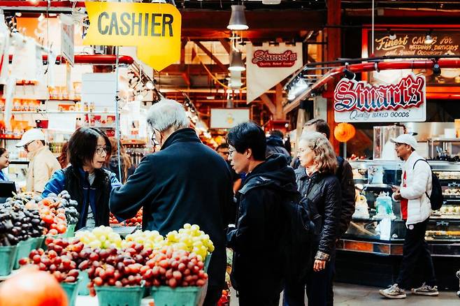 아무리 시장 방문에 회의적인 관광객일지라도, 그랜빌 아일랜드 퍼블릭 마켓의 문을 여는 순간 고개를 끄덕이게 된다. 그 납득 가능한 이유의 팔 할은 풍경에 있다. 일단 위치 설명부터 선제되어야겠다. 마켓이 있는 곳은 그랜빌 아일랜드. 1970년대 산업 쇠퇴 이후, 기존 공장과 창고를 재활용해 시장과 문화 공간으로 전환한 밴쿠버의 대표적인 도시 재생 지구다. 그 한가운데에 있는 대형 실내 시장이 바로 그랜빌 아일랜드 퍼블릭 마켓이다.
