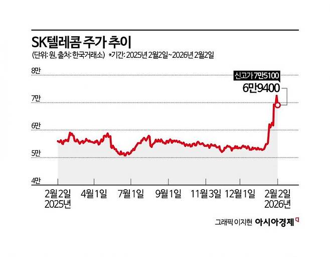 SK텔레콤 주가는 지난달 30일 7만5100원까지 오르며 52주 신고가를 달성했다. 상승세는 지난달 13일부터 시작됐다. 당시 주가는 5만4300원(종가 기준)을 기록했다. 이후 20일에 6만2200원에 도달해 2024년 11월27일(6만1000원) 이후 14개월 만에 6만원대에 진입했다. 6만원대 진입은 2000년 액면분할 이후 역대 두 번째다. 주가는 여기서 그치지 않고 상승 곡선을 그리며 종가 기준 7만원대(7만2500원)를 역사상 처음으로 기록했다. 지난 2일 코스피가 5%대 급락하며 6만9100원(4.69%)으로 내려앉았지만, 3일 다시 7만원대로 올라서는 등 순항 중이다.