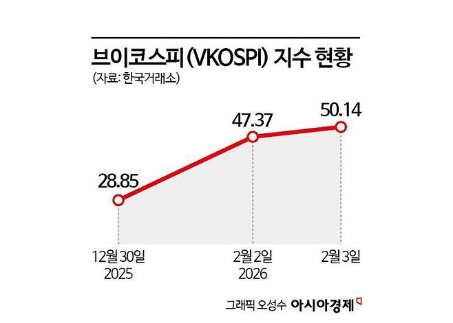 4일 '한국형 공포지수'로 불리는 코스피200 변동성지수(VKOSPI)는 전날 종가 기준 50.14를 기록했다.