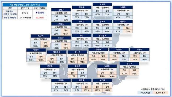 4일 부동산 플랫폼 다방이 서울 전용면적 33㎡ 이하 빌라 원룸 전월세를 분석한 '다방여지도'에 따르면 지난해 12월 기준 원룸 보증금 1000만원 기준 평균 월세는 64만원입니다.
