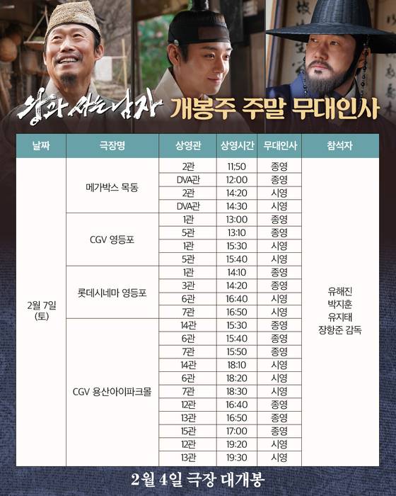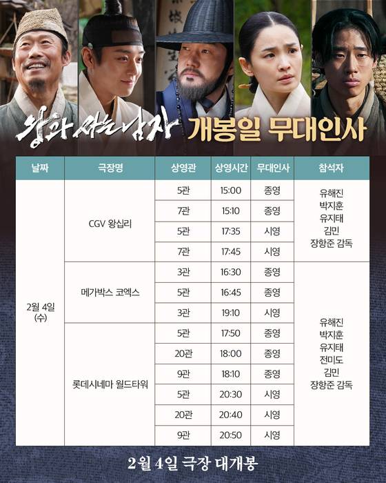 개봉일인 4일 장항준 감독과 배우 유해진 박지훈 유지태 전미도 김민까지 '왕과 사는 남자' 팀 완전체는 CGV 왕십리, 메가박스 코엑스, 롯데시네마 월드타워를 차례대로 방문해 개봉 첫 날부터 '왕과 사는 남자'를 관람해준 관객들에게 진심어린 감사를 표하며 특별한 시간을 함께 할 것으로 기대를 모은다.