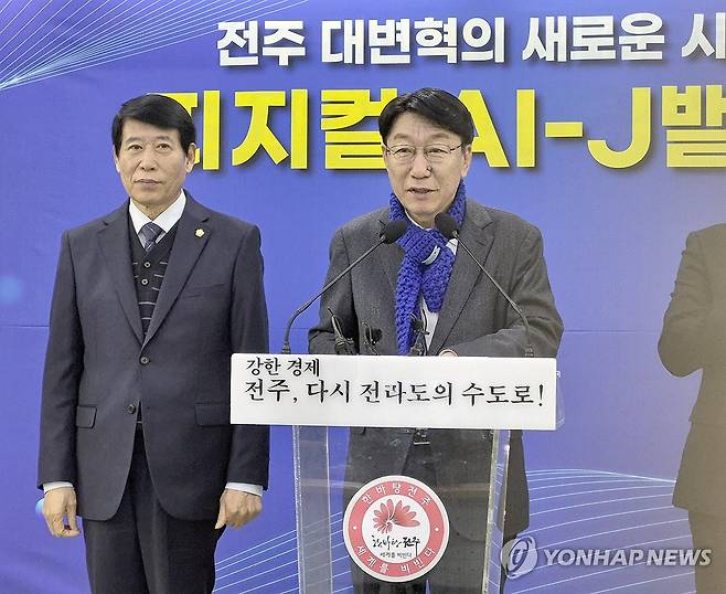 (전주=연합뉴스) 김동철 기자 = 우범기 전북 전주시장(오른쪽)과 남관우 전주시의회 의장이 4일 전주시청에서 기자회견을 열고 "전북도와 지역 정치권, 중앙부처 등과 긴밀히 협력해 100만㎡ 규모의 피지컬 AI-J밸리를 조성하겠다"고 밝히고 있다. 2026.2.4