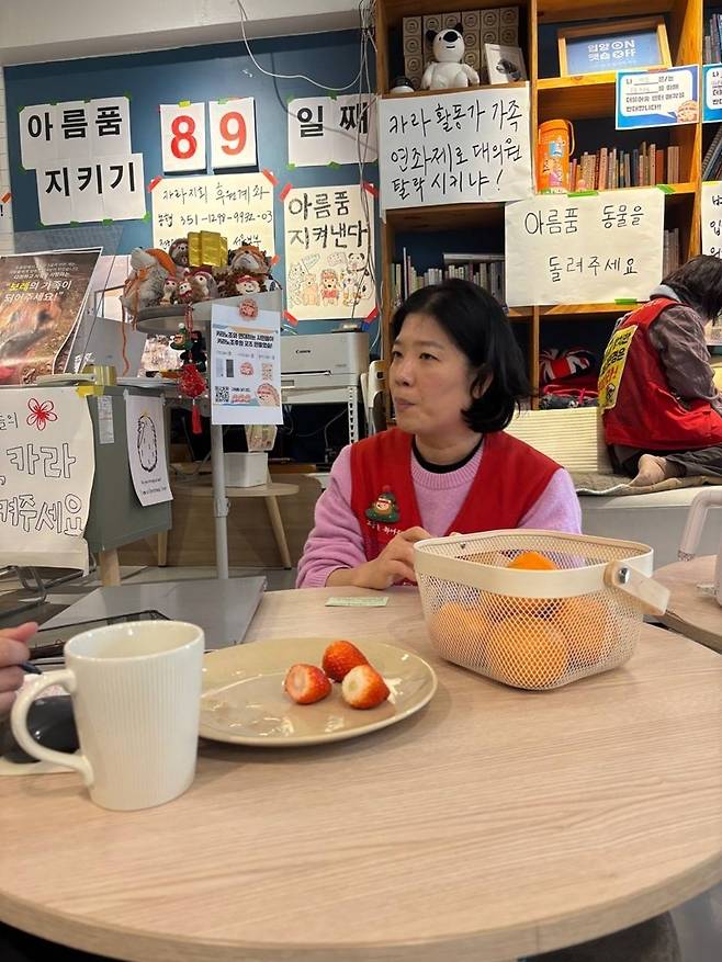89일 째(1월 30일 기준) 카라 더불어숨 센터 2층의 '입양센터 아름품'에서 농성 중인 고현선 카라노조 지회장을 지난 1월 30일 만났다.