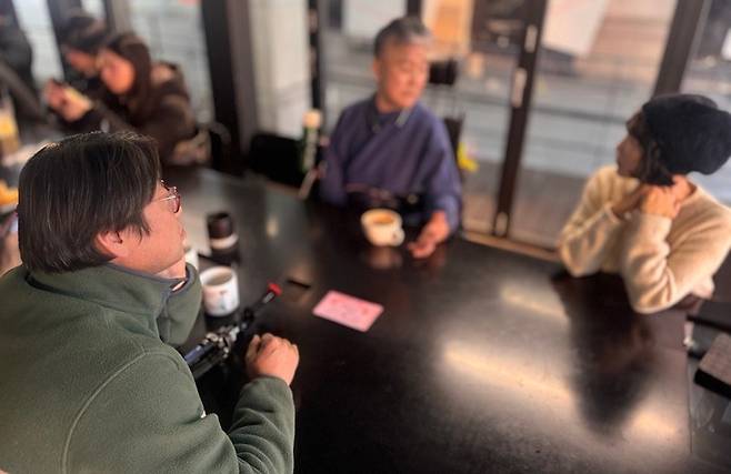 ▲ 2026년 12월 17일 서울역 인근 카페에서 제주해녀문화연구원 감태 님과의 첫 만남 자리. 왼쪽부터 스쿠버 다이빙을 하겠다는 중증장애인을 만나러 제주에서 올라온 감태, 세종에서 올라온 Moon과 호미가 이야기 나누고 있다. 이후 두 차례의 줌 회의를 거쳐 2월 7일 첫 스쿠버 다이빙 교육을 받는다. 방중식 감독도 함께다. (호미 제공 사진) |