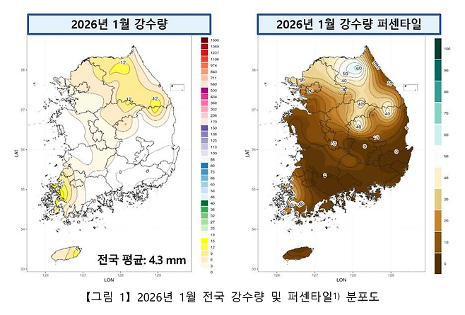 그러나 전국적으로는 유례없이 메마른 1월이었습니다. 기상청은 1월 전국 평균 강수량이 4.3mm로 역대 두 번째로 적었다고 분석했습니다. 평년(26.2mm)과 비교하면 19.6%에 머물렀는데, 지난달 강수일수는 3.7일로 평년보다 2.8일 적었습니다.