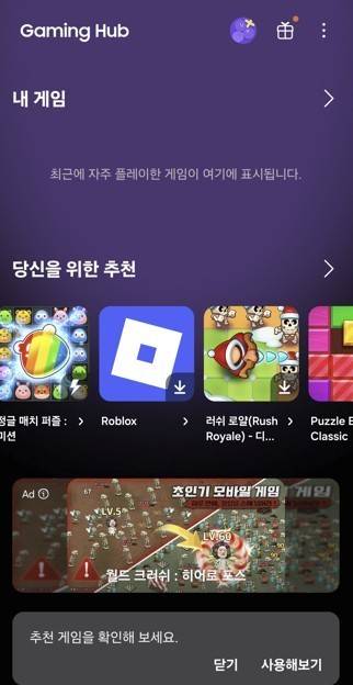 [개편된 갤럭시 게이밍허브 메인 화면]