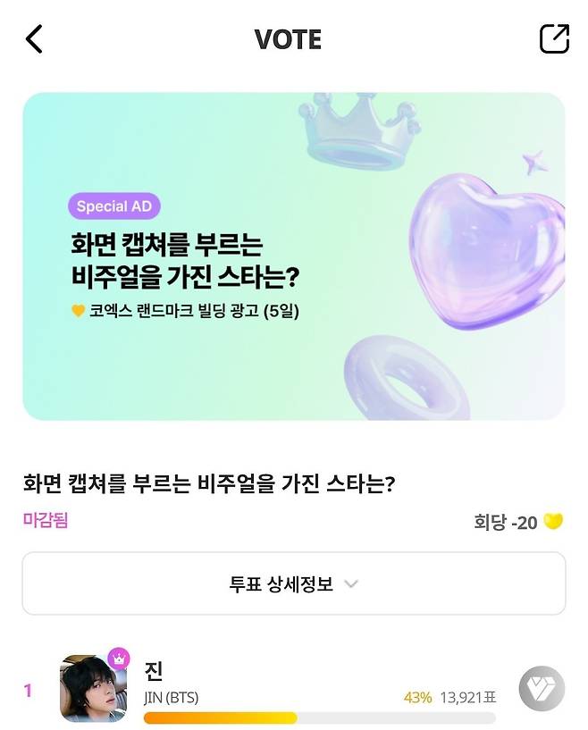 해당 투표에서 1위를 차지한 진에게는 5일간 서울 코엑스 랜드마크빌딩 전광판 광고가 제공된다.