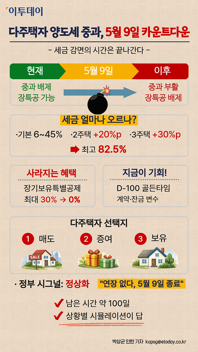 다주택자들에게 주어진 ‘세금 감면의 시간’이 카운트다운에 들어갔습니다. 다주택자 양도소득세 중과 한시 배제 조치가 오는 5월 9일 종료를 앞두면서(현행 기준), 부동산 시장의 셈법이 다시 복잡해지고 있습니다.