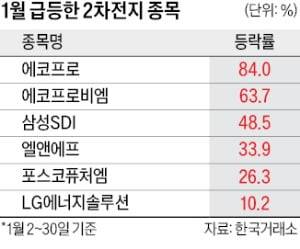 4일 한국거래소에 따르면, 1월 한 달간 에코프로 주가는 84% 넘게 상승했다. 같은 기간 에코프로비엠(63.7%), 삼성SDI(48.5%), 엘앤에프(33.9%), 포스코퓨처엠(26.3%), LG에너지솔루션(10.2%) 등 주요 2차전지 종목도 큰 폭으로 올랐다.