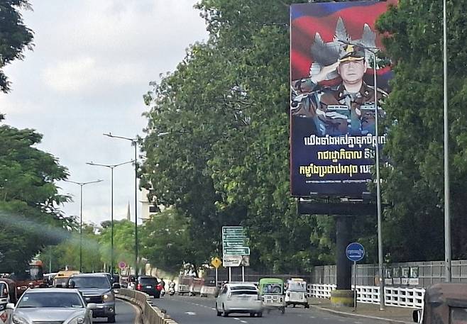 | ▲ 군복을 입은 채 거수 경례를 하고 있는 훈 마넷 총리의 모습을 담은 대형 홍보판이 프놈펜 시내 곳곳에 걸려 있다. |