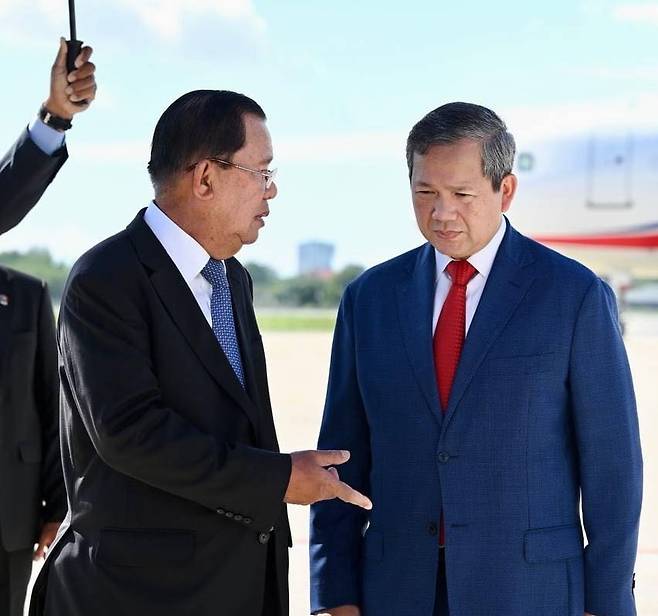 | ▲ 부친인 훈 센 상원의장(왼쪽)과 훈 마넷 현 캄보디아 총리가 대화를 나누고 있다. |
