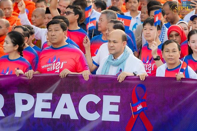 | ▲ 지난해 태국의 무력 침공에 맞서 평화행진을 펼치고 있는 훈 센 상원의장의 삼남 훈 마니(가운데 흰 옷. 현 부총리) |