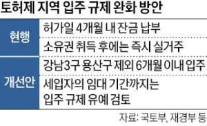 현행 규정상 토지거래허가구역에서 주택을 매입한 경우 매수자는 거래를 허가받은 날로부터 4개월 안에 잔금을 치르는 동시에 입주해야 한다. 임대차 계약 만료가 4개월보다 더 길게 남은 집은 사실상 매물로 나올 수 없는 구조다. 잔금 기한을 6개월로 연장해 잠재 매물을 늘리려면 토지거래허가구역에서 규정한 입주 시한도 함께 조정해야 한다. 재경부 관계자는 “신규 규제지역에만 토지거래허가 주택 매수 때 입주 시한을 4개월이 아니라 6개월로 하는 방안을 검토할 것”이라고 말했다.