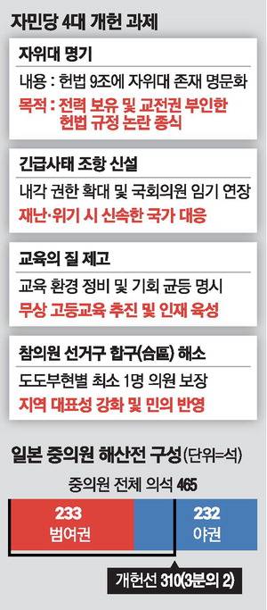 자민당이 또 다른 개헌 과제로 내세우는 것은 '긴급사태 조항 신설'이다. 대규모 자연재해나 전쟁·테러 등 국가적 비상 상황에서 정부가 보다 신속하게 대응할 수 있도록 헌법적 근거를 마련하자는 취지다.