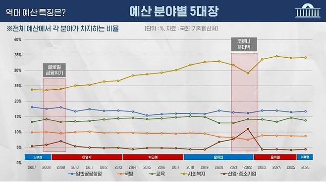 이명박 정부 때는 전체 예산 대비 복지 분야는 평균 24.9%, 박근혜 정부는 평균 28.6%, 문재인 정부 평균 31.6%, 윤석열 정부 평균 34.1%, 이재명 정부 첫 예산 34.2%였습니다.