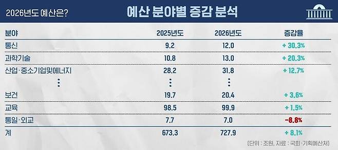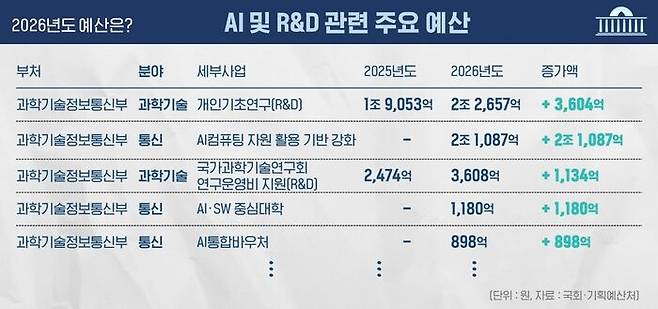 정부가 통신, 과학기술, 산업·중소기업 및 에너지 분야를 크게 늘린 건, AI 산업 부흥과 관련 있습니다. 정부는 지난해 'AI 대전환'을 모토로 산업·일상 전반을 바꾸겠다고 선언했는데, 이 부분이 반영돼 있다고 볼 수 있습니다. R&D 분야 증가와도 맞물려 있습니다.