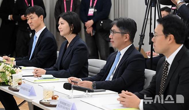 [서울=뉴시스] 청사사진기자단 = 최수연 네이버 대표를 비롯한 임원진이 4일 경기 성남시 네이버 1784에서 문화콘텐츠 현장 방문 차 네이버를 찾은 김민석 국무총리의 인사말을 듣고 있다. 왼쪽부터 유봉석 네이버 최고책임경영책임자(CRO), 최 대표, 김유원 네이버클라우드 대표, 김규남 네이버웹툰 최고위기관리책임자(CRO). 2026.02.04. photo@newsis.com